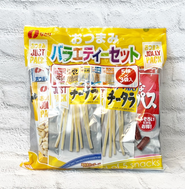 おつまみメーカー なとり の人気アイテムを詰め合わせた、お得な 「おつまみバラエティセット」。 チータラをはじめ、ピーナッツやサラミなど定番のおつまみが 5種類 × 各3袋(合計15袋) 入った、お酒のお供にもお子さまのおやつにもぴったりのアソートパックです。 それぞれが 食べきりサイズの個包装 だから、シェアにも保存にも便利。 「今日はどれにしよう?」と選ぶ楽しさも魅力のひとつ。 おつまみ時間をもっと手軽に、もっと美味しくしてくれる万能セットです。 カルパス・バタピー・チータラ・いかそうめん・焼かまぼこの5種類をお楽しみいただけます。