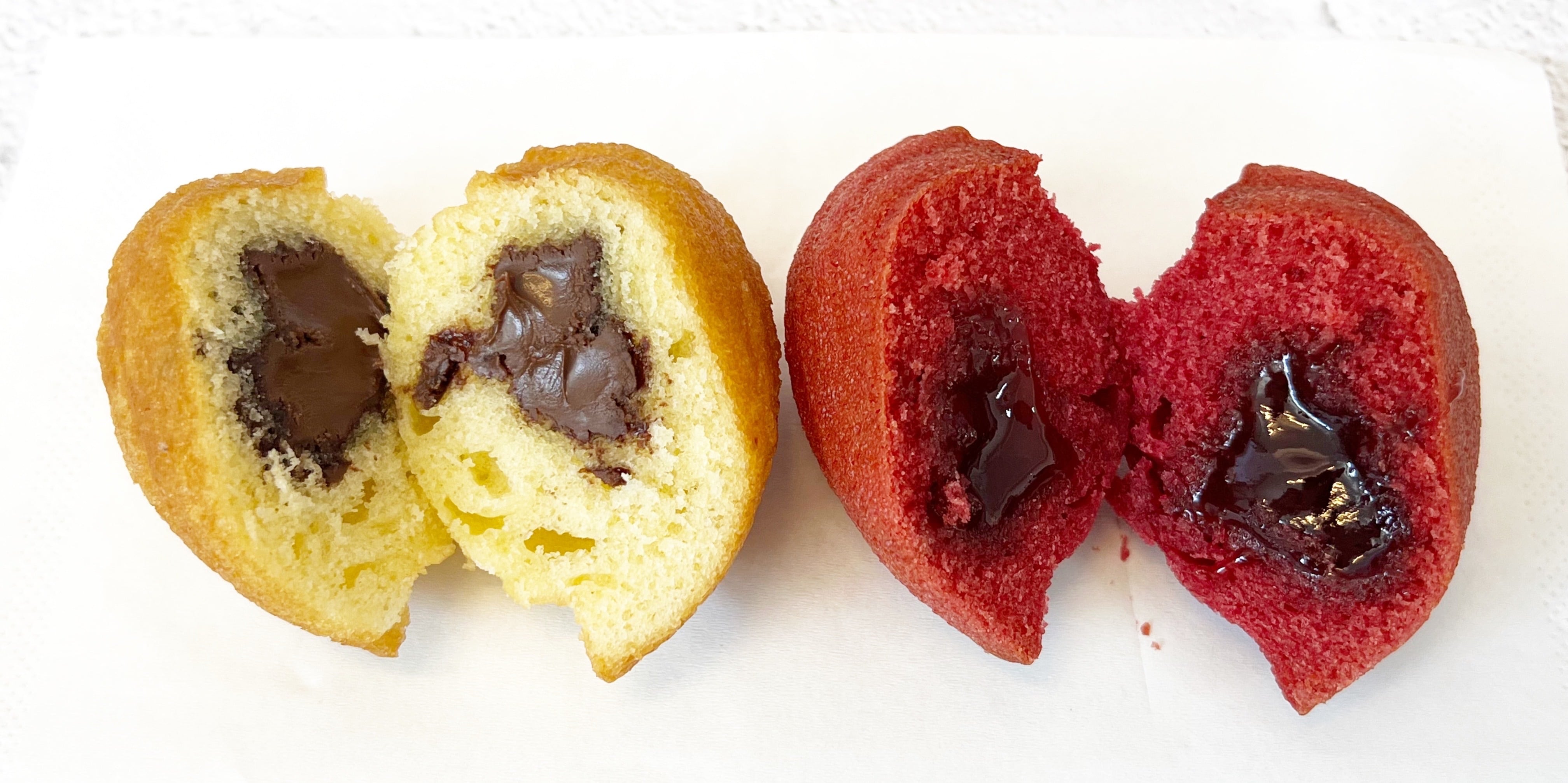 しっとりと焼き上げたマドレーヌの中に、とろりと濃厚なヘーゼルナッツチョコレートとラズベリーソースを閉じ込めています。